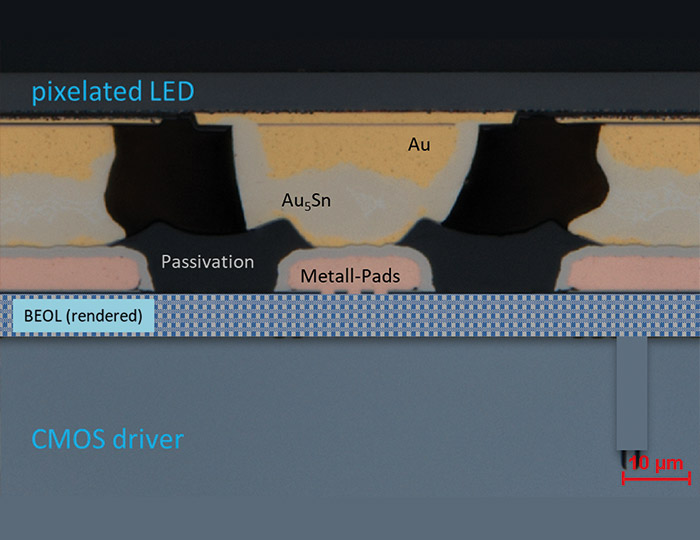 The pixelated LED chip used later in the project consisted of a gallium nitride base grown on sapphire. When such an LED chip is mounted and bonded to a Si-based CMOS chip, there is a difference in the coefficient of expansion. At the time, it was unclear whether it would be possible to reliably bond the LED chip of this size to silicon, because the combination and the mounting process were still very new at that time.