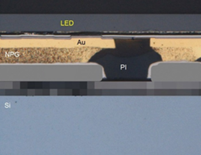 Hermann Oppermann: At Fraunhofer IZM, we considered several baseline technologies. In the end, two approaches made it into the final selection: a gold-tin alloy and a nanoporous gold structure. The gold-tin alloy is a proven soldering process, but at that time had not been applied in fine-pitch areas with such high contact density. We were asked to achieve spacing of 15 µm on the LED chip. We decided on this approach because it is stable at high temperatures, reliably conducts high currents, ensures efficient heat dissipation, and is easy to process.