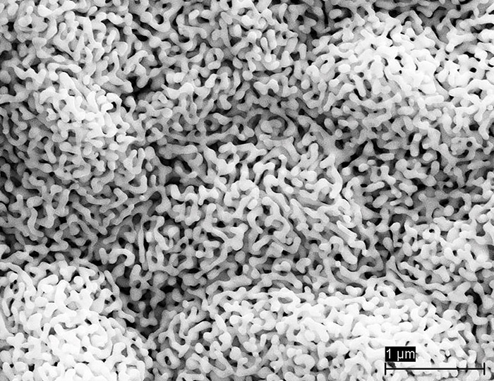 Left: Nanoporous gold forms a sponge-like structure with approximately 70% porosity
